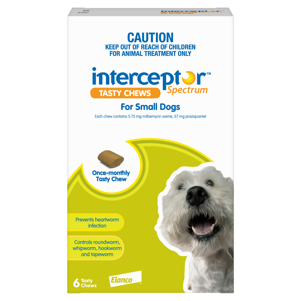 Interceptor Spectrum Chews for Dogs are used monthly for the prevention of heartworm (Dirofilaria immitis) infection, control of adult roundworm (Toxocara canis, Toxascaris leonina), immature roundworm (Toxocara canis), adult whipworm (Trichuris vulpis), adult hookworm (Ancylostoma caninum), adult tapeworm (Echinococcus granulosus, Taenia pisiformis and Dipylidium caninum) and aid in the control of adult hookworm (Uncinaria stenocephala) infection in dogs.